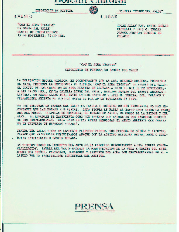 Sandra Del Valle tiene un lenguaje plástico propio, sus personajes sueñan y sienten, parece que estuvieran ensimismados aunque que con la actitud reflejen deseo amor o cualquier sentimiento o pasión humana."